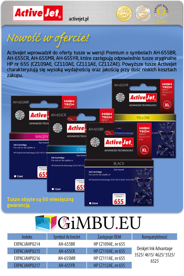 | Kod OEM | HP 655 CZ109AE | HP 655 CZ110AE | HP 655 CZ111AE | HP 655 CZ112AE |