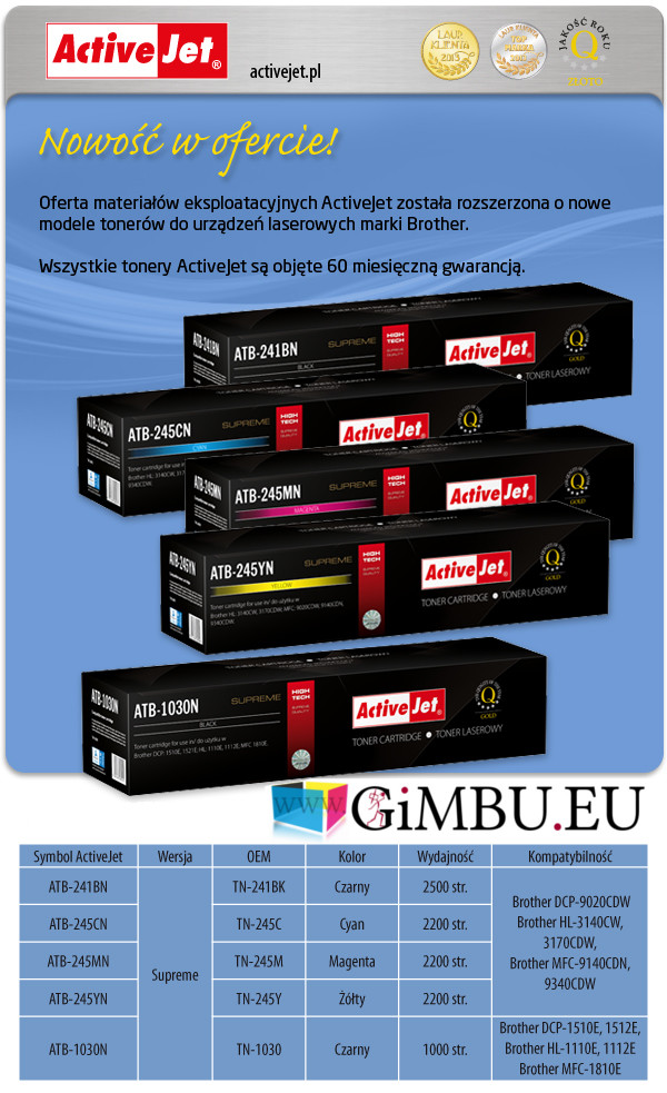 Activejet ATB-241, ATB-245 to najlepsze zamienniki tonerów TN-241BK i TN-241CMY do kolorowych drukarek laserowych Brother DCP: 9020CDW; HL: 3140CW, 3170CDW; MFC: 9140CDN, 9340CDW.