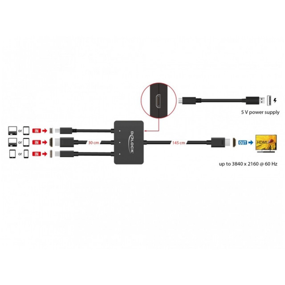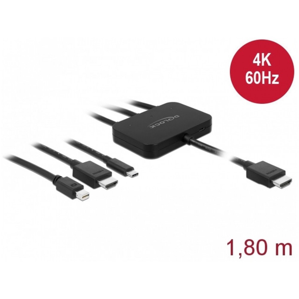 Kabel Delock może być wykorzystany do połączenie projektora bądź monitora z wejściem HDMI do laptopa za pomocą interfejsu HDMI, USB Type-C™ lub mini DisplayPort.
